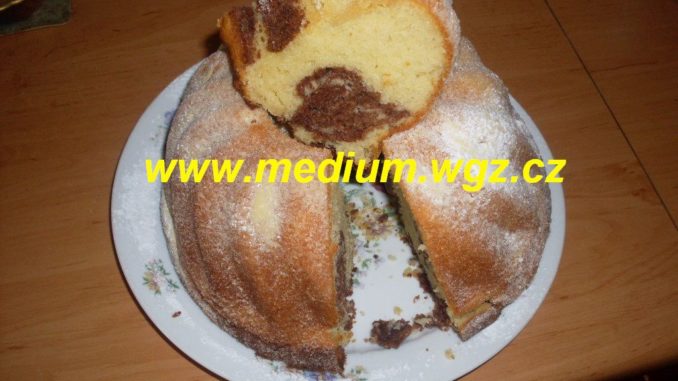 Z bílků si nejdříve ušleháme tuhý sníh. Máslo, cukr, vanilkový cukr a žloutky utřeme do pěny. Přidáme mouku s práškem do pečiva a mléko, promícháme. Nakonec zlehka vmícháme sníh z bílků. 2/3 těsta nalijeme do formy, kterou vymažeme tukem a vysypeme hrubou moukou, do zbývající třetiny přidáme vrchovatou lžíci kakaa a trochu mléka. Promícháme a nalijeme na světlé těsto, vařečkou lehce promísíme. Pečeme na 160 – 170 stupňů zhruba 35 – 40 minut. Upečenou bábovku opatrně vyklopíme a pocukrujeme.