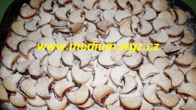 Zaděláme hladké těsto, necháme nejlépe do druhého dne v lednici. Potom těsto vyválíme, vykrájíme z něj půlměsíčky. Pečeme na 160 stupňů. Vychladlé slepujeme marmeládou a pocukrujeme.
