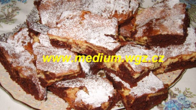 Stěrkou nebo vařečkou zlehka promísíme s těstem, aby nám vznikl mramorový vzhled, a dáme péct na 170 stupňů asi tak na 20 – 30 minut, záleží na troubě. Upečený moučník pocukrujeme a vychladlý krájíme.