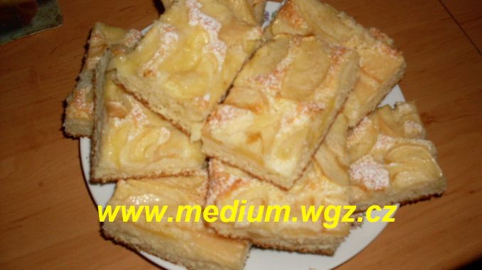 Vše zamícháme, nalijeme na plech vyložený pečícím papírem. Jablka zbavíme jádřinců, oloupeme a nakrájíme na plátky, poklademe na těsto po celé ploše, posypeme vanilkovými cukry a dáme péct na 180 stupňů asi na půl hodinky.