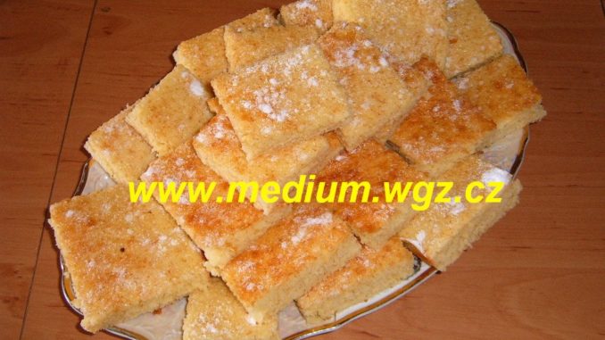 Všechny suroviny zamícháme dohladka, nalijeme do pekáčku vyloženého pečícím papírem a pečeme 15 – 20 minut při 170 stupních. Po upečení ještě teplé pocukrujeme.