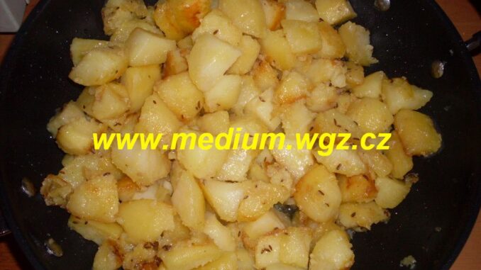 - Máslo rozpustíme a hodíme na něj očištěné, nakrájené brambory.