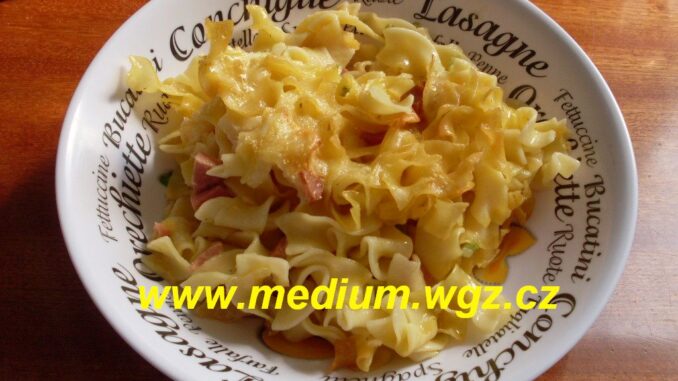 - Přidáme uzené maso, orestujeme, přidáme pepř a Vegetu.